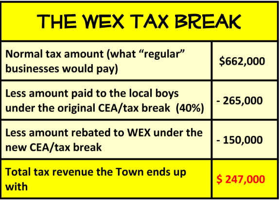 In short, the WEX deal means $2.25 million more tax dollars will flow into corporate pockets rather than into Town or school support.