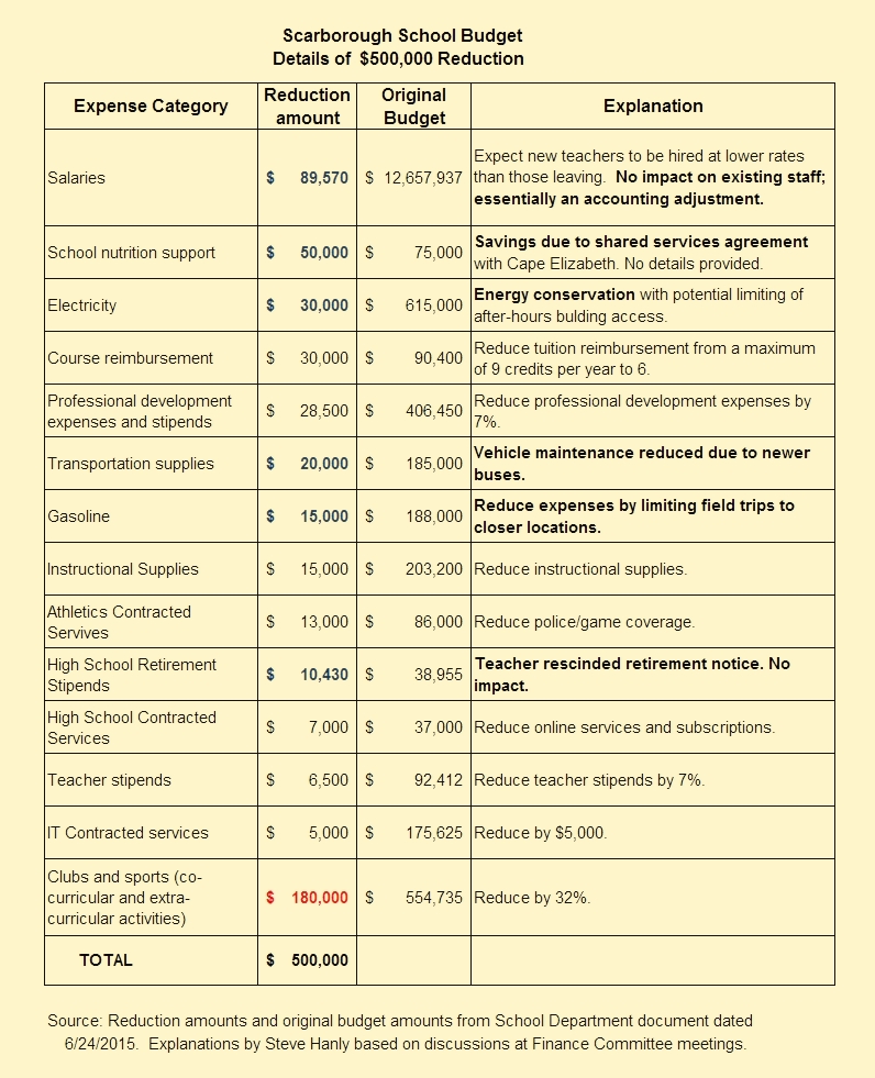 However you care to characterize the $320,000, one thing is clear – the elimination of it from the school budget will not impact academic programs. How can we be so sure of that? Well, for $250,000 of that amount, we direct you to Superintendent Entwistle’s June 22, 2015 “Budget Update” (link here) in which he describes “$200,000 of these reductions, however, would depend upon a fundamental shift in established budgeting practice related to planning for a small amount of fund surplus to accrue during the budget year (to serve as a cushion for any unanticipated expense(s).” [Emphasis added.] He continued: “Another $50,000 was identified as potential savings to be generated by a shared-services agreement with Cape Elizabeth for our new Director of School Nutrition.Sounds like a good shift in budgeting practice to us. Perhaps there are even more cushions to be found.