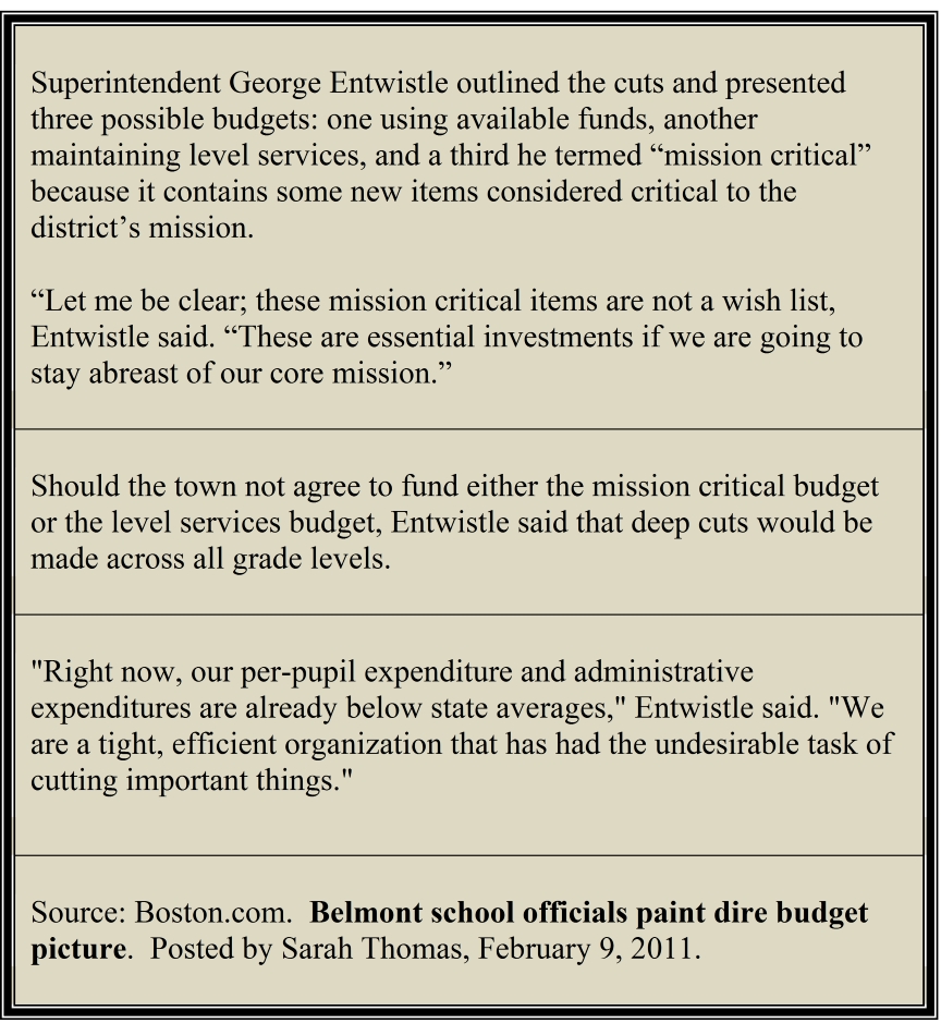 Mr. Peabody: “Today Sherman we only go back to 2011. We’ll be visiting the posh Boston suburb of Belmont, where the school budget is facing a $2.9 million shortfall. A huge community outcry has arisen over threats to make deep cuts to music, art, foreign language, social studies, and library programs. Let’s see what Belmont’s superintendent of schools, George Entwistle, has to say…”
