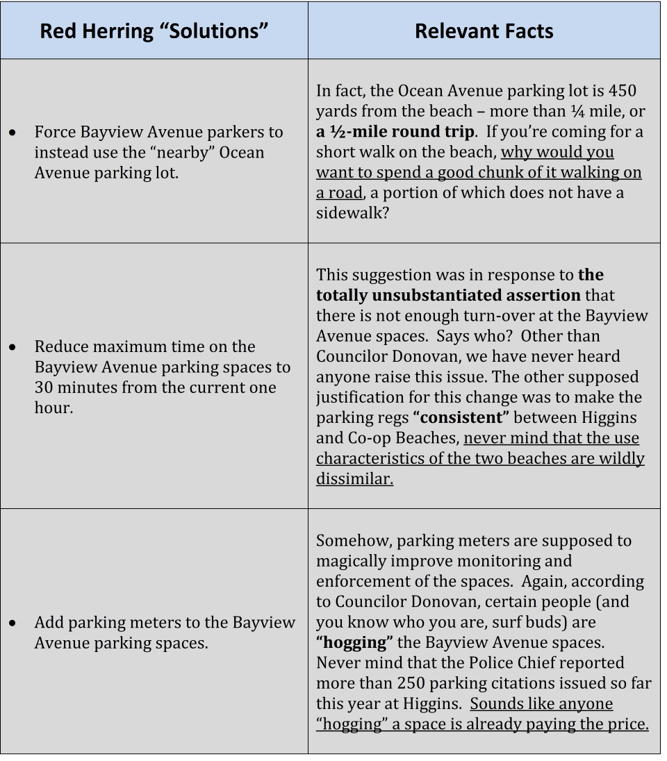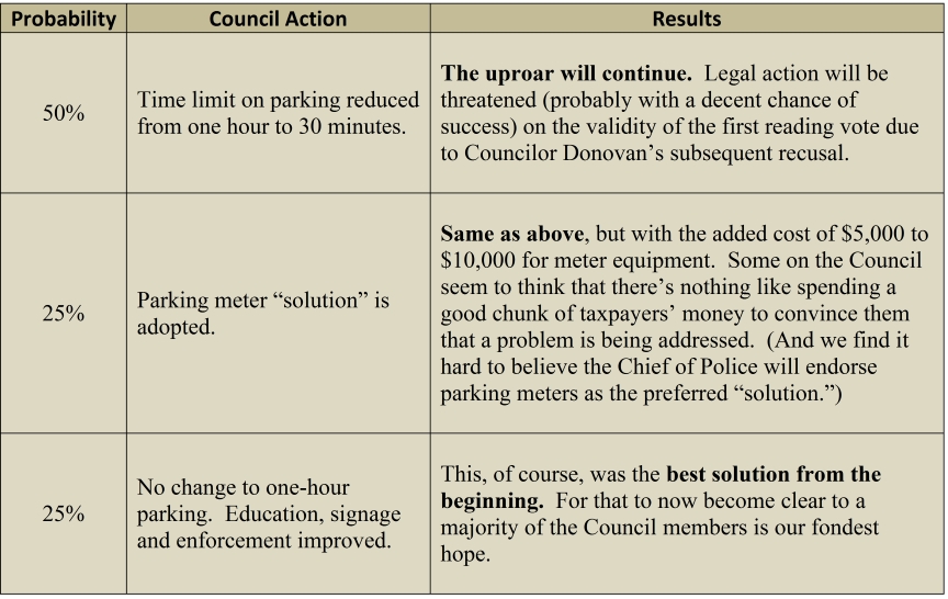 .After hearing all the pleas and speechifying, here’s our handicapping of the likely Council action on the Bayview Avenue parking spaces at the October 7 meeting:
