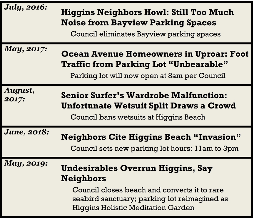 As you may recall, we often look to our office cleaning lady, Mrs. Kincaid, when we need down-to-earth advice or commentary. Well, it happens that her sister, Mrs. O’Malley, is visiting from Ireland for a few weeks. And Mrs. O. is one of those very few with the gift of “second sight,” or the ability to see into the future. Not always and not in every case, but often enough to be slightly spooky. In any event, we asked Mrs. O. if she could tell us anything about the future of Higgins Beach… and we hit pay dirt. She kindly relayed the following future newspaper headlines to us: